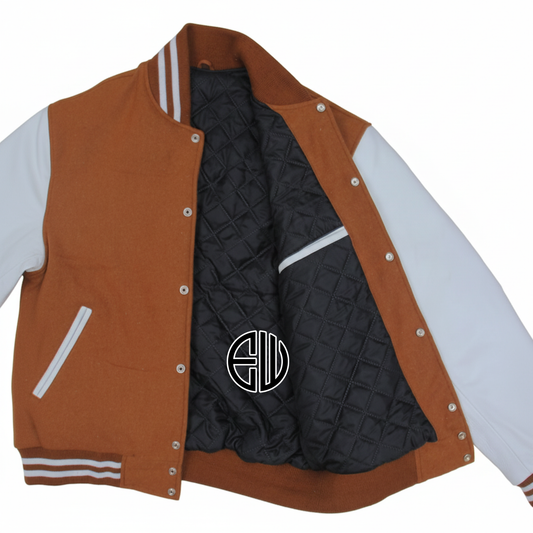 Brown Wool White Leather Sleeves Varsity Baseball Jacket