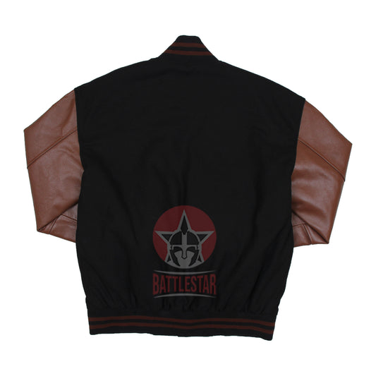 Black Wool Brown Leather Sleeves Varsity Baseball Bomber Jacket
