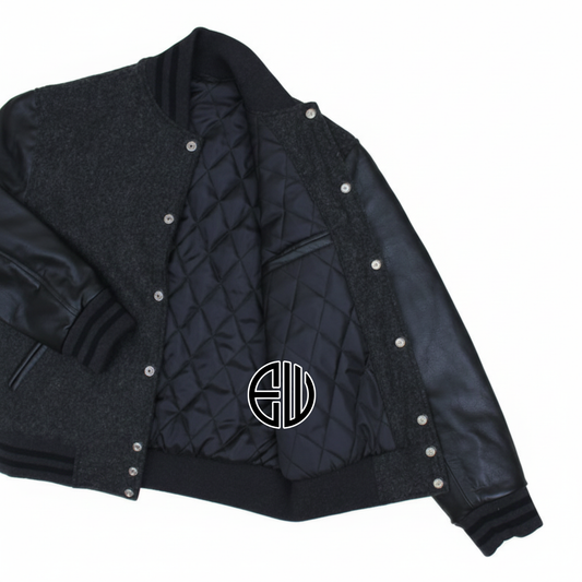 Dark Gray Wool Black Leather Sleeves Varsity Baseball Jacket