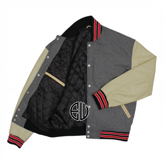 Gray Wool Cream Leather Sleeves Varsity Baseball Jacket
