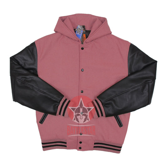 Baby Pink Wool Black Leather Hooded Baseball Letterman Varsity Jacket