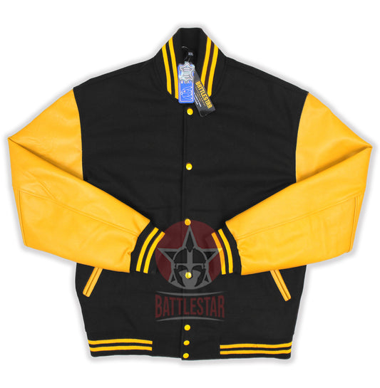 Black Wool Gold Yellow Leather Sleeves Varsity Jacket