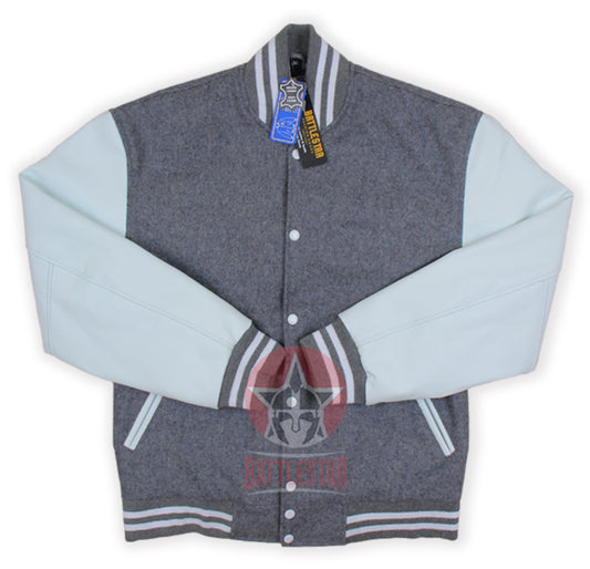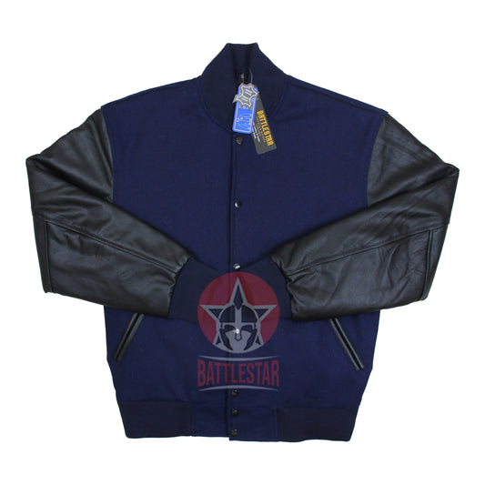 Navy Blue Wool Varsity Jacket With White Leather Sleeves