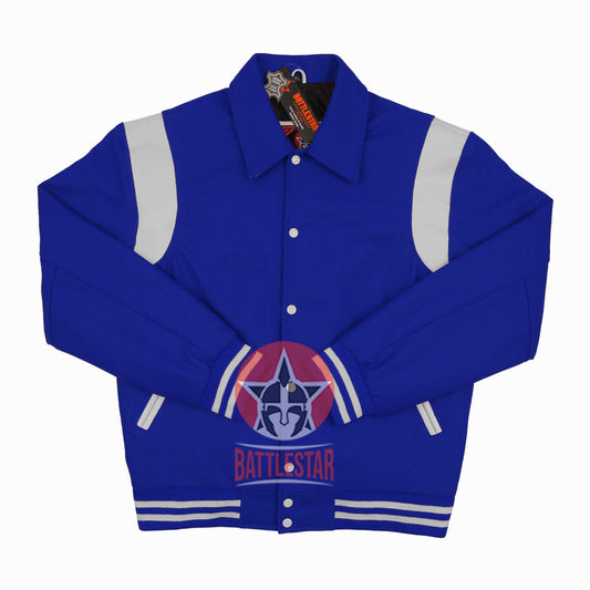Byron Collar Royal Blue Wool White Leather Stripes Varsity Baseball Jacket