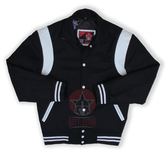 Byron Collar Black Wool White Leather Stripes Varsity