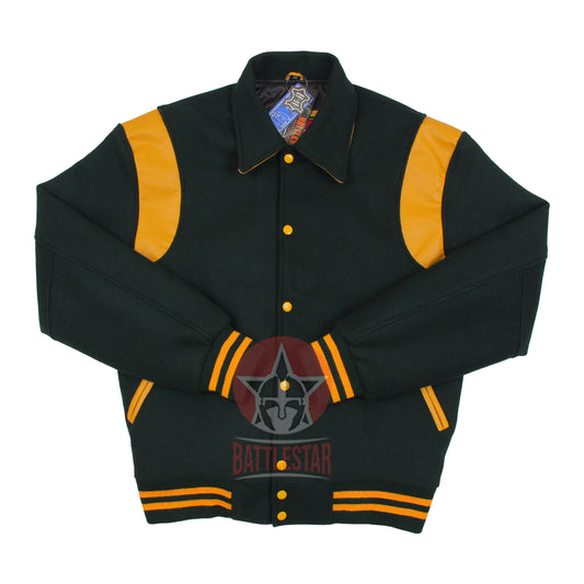 Byron Collar Forest Green Wool Gold Yellow Leather Stripes Varsity Baseball Jacket