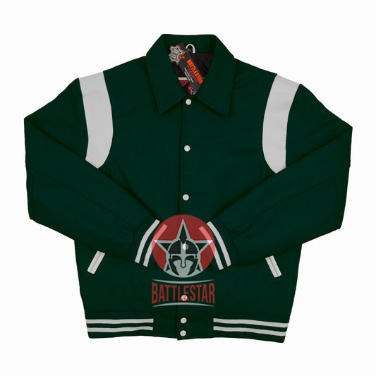 Byron Collar Forest Green Wool White Leather Stripes Varsity Baseball Jacket