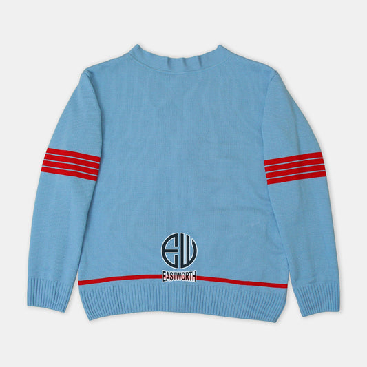 Handmade Unisex Jacquard Knitted Sky Blue & Red Cardigan School College Graduation Greek Sweater