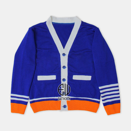 Handmade Unisex Jacquard Knitted Royal Blue-White & Orange Cardigan School College Graduation Greek Sweater