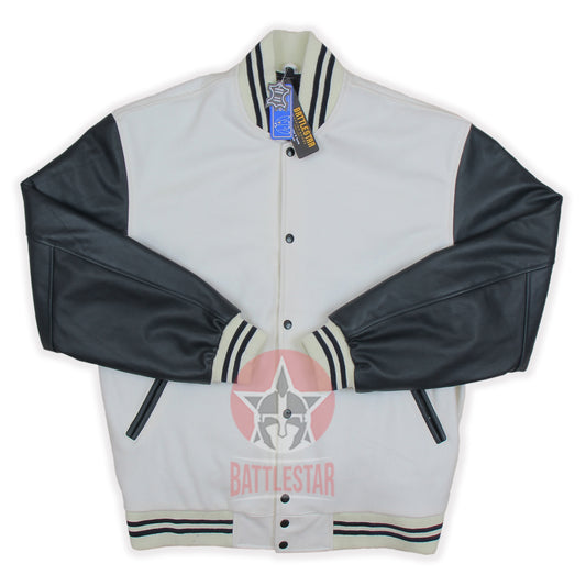 Black Wool White Leather Sleeves Varsity Bomber Baseball Jacket