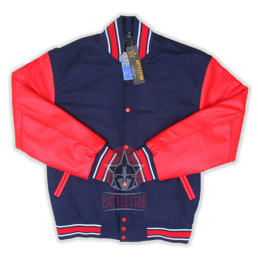 Navy Blue Wool Varsity Jacket Red Leather Sleeves