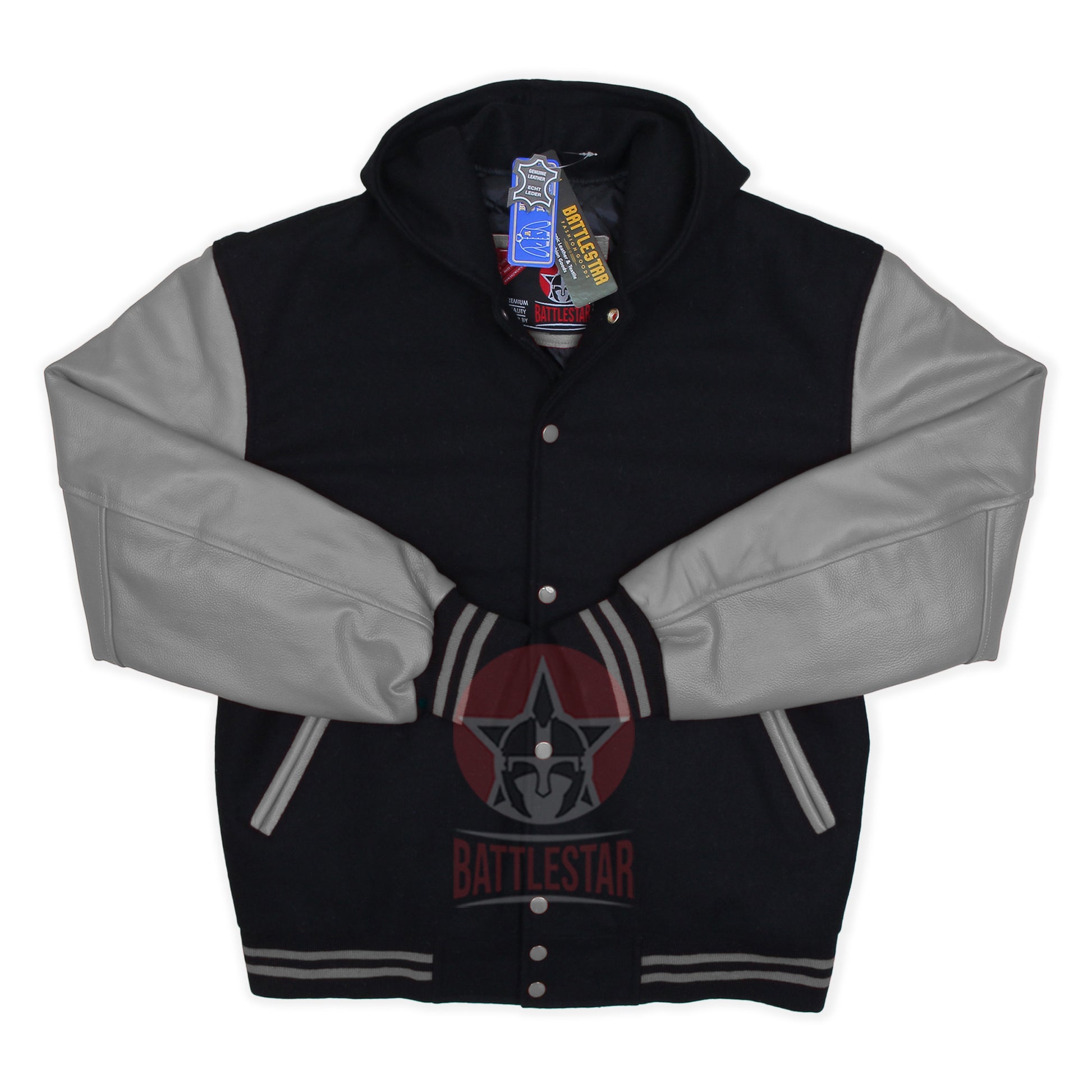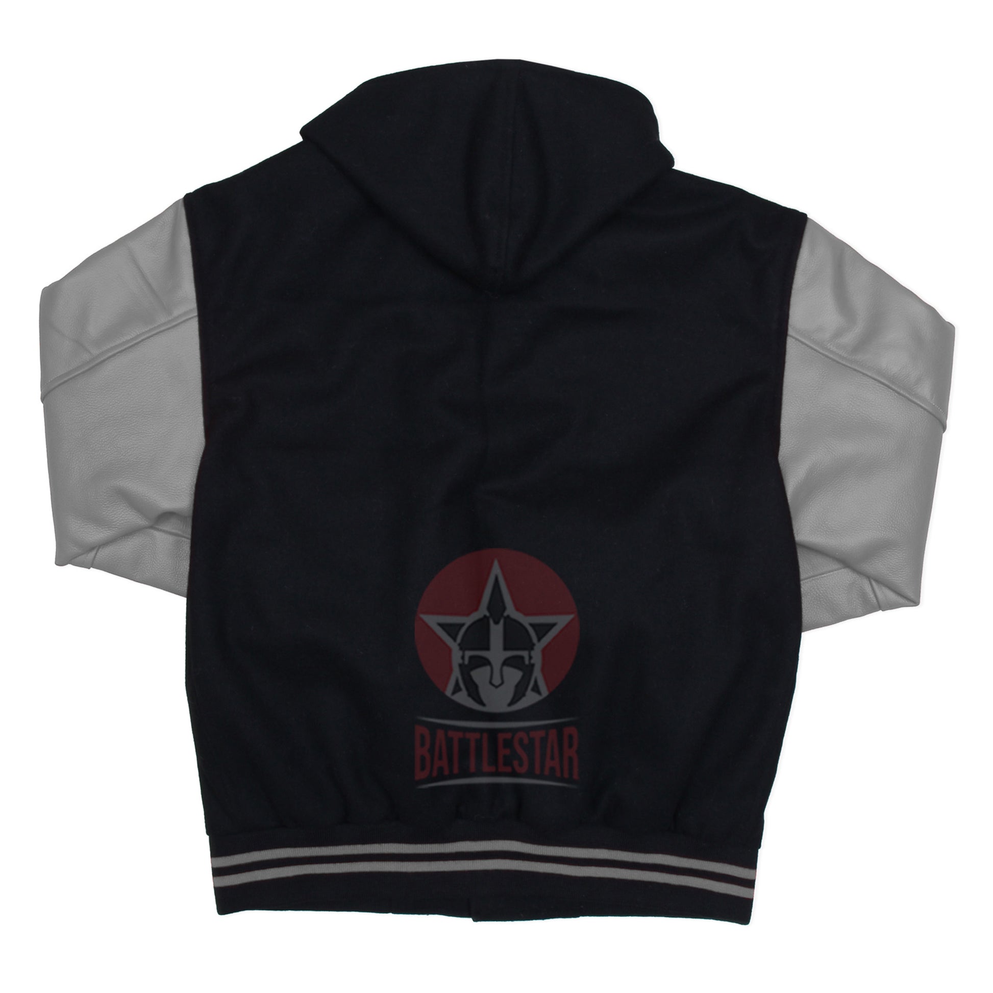 Black Wool Gray Leather Sleeves Hooded Varsity Jacket