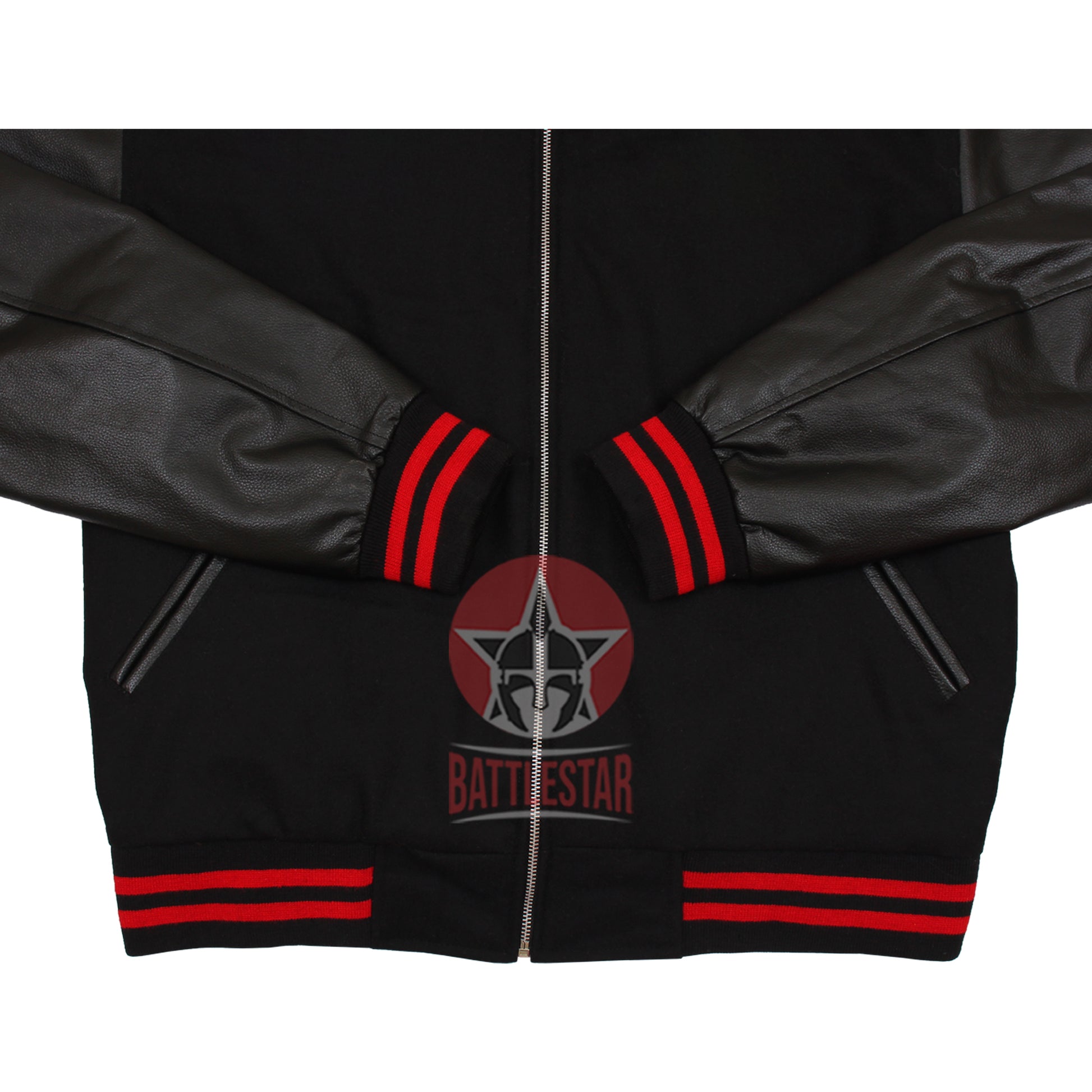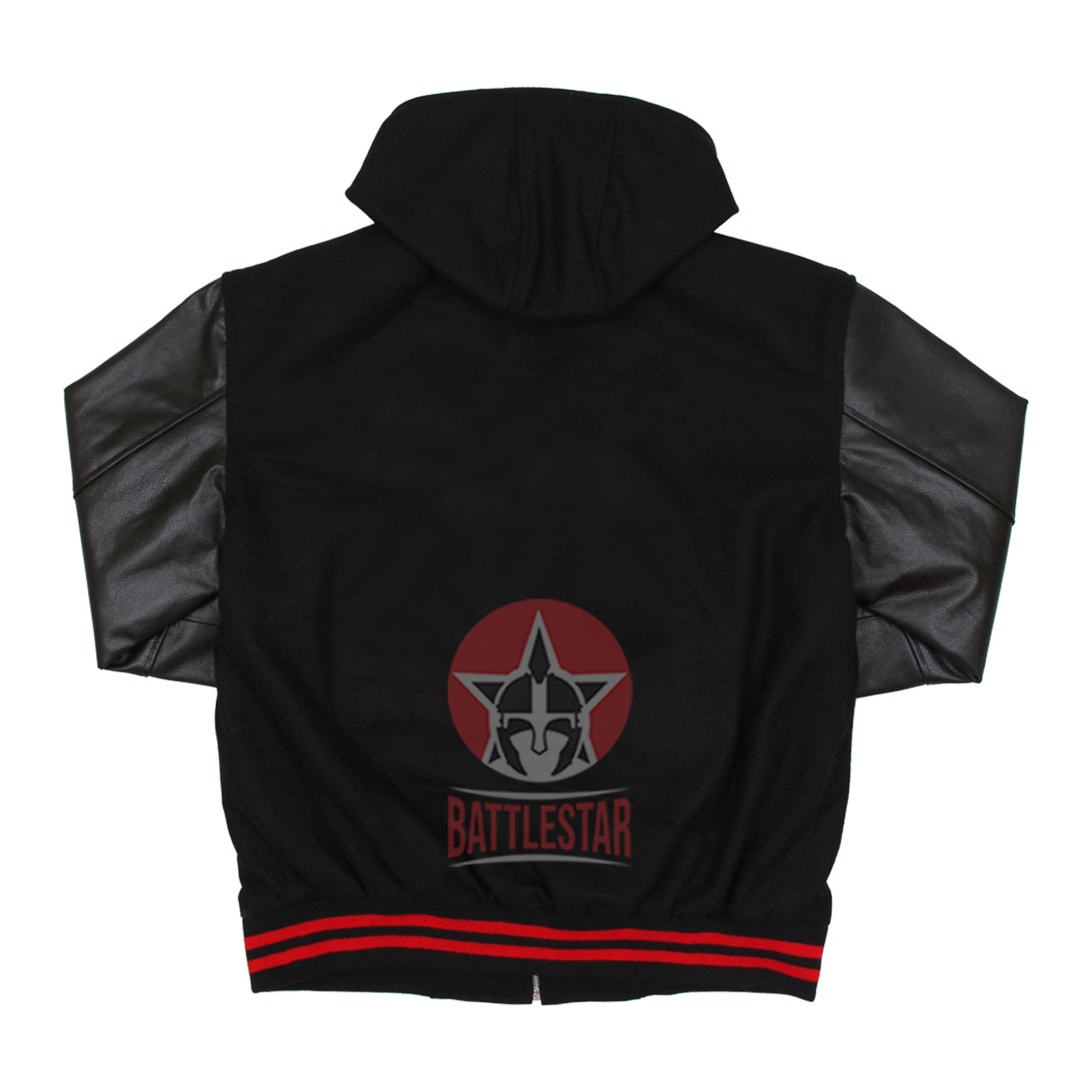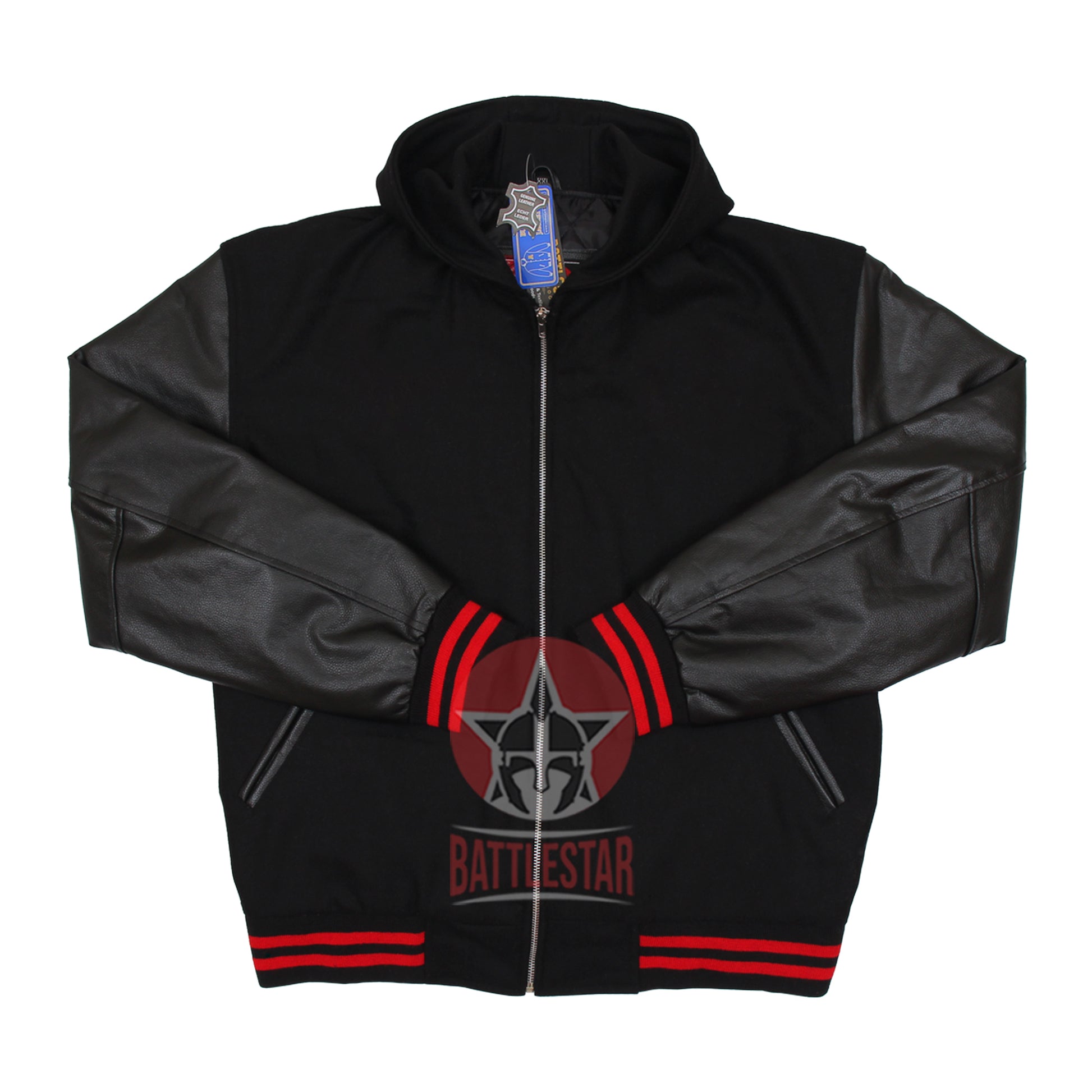 Black Wool Leather Zipper Hooded Letterman Varsity Jacket