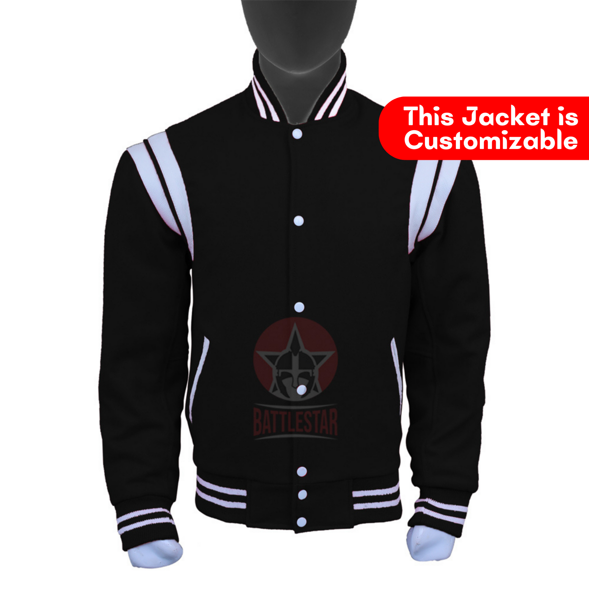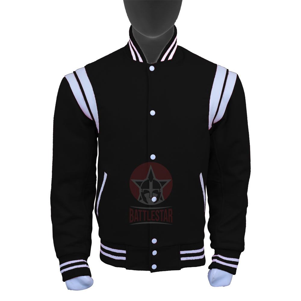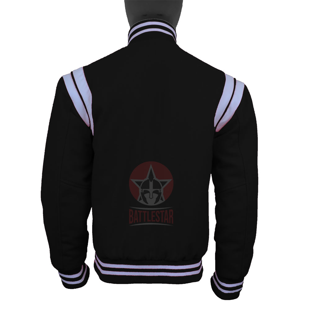 Black Wool White Leather Stripes Stylish Varsity Jacket