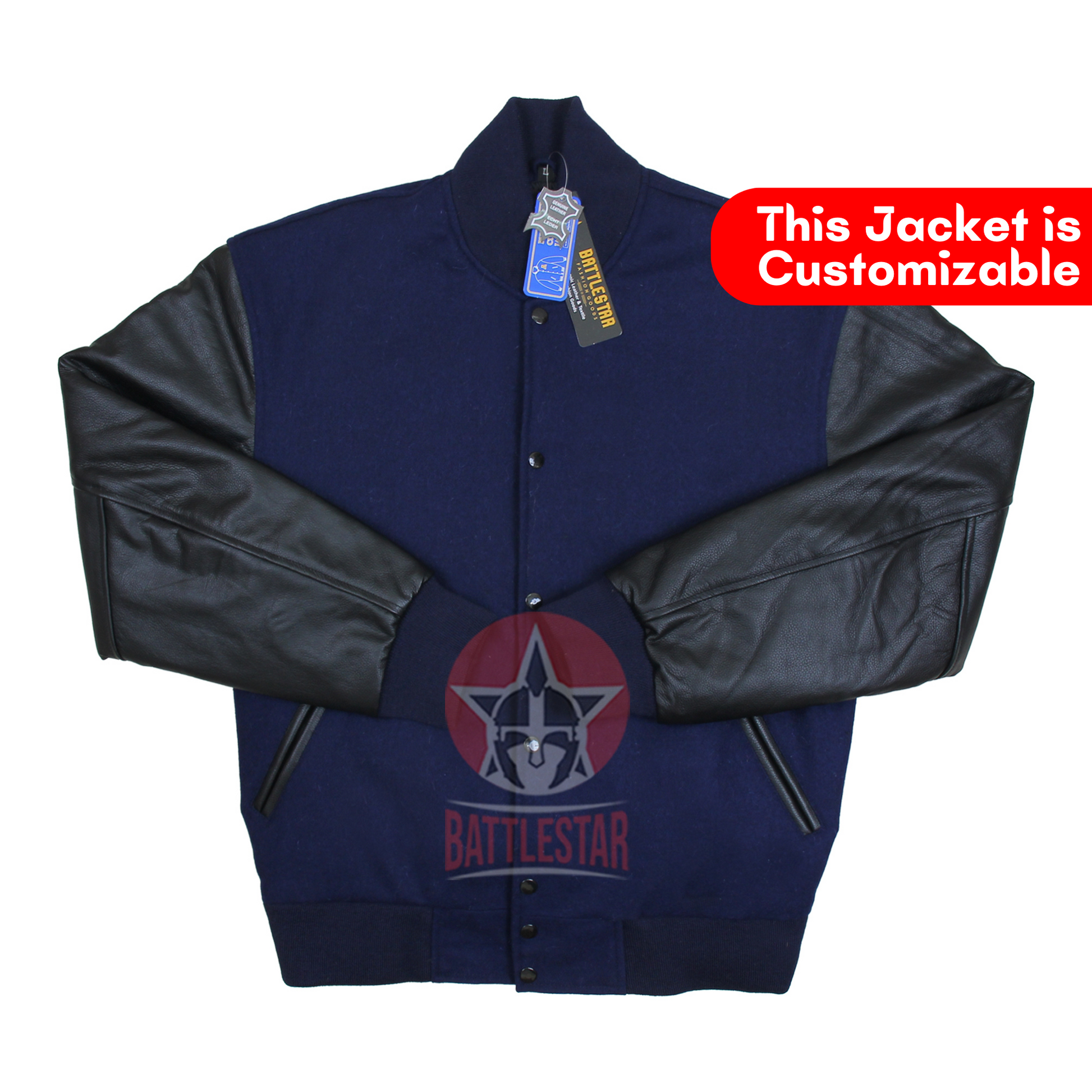 Navy Blue Wool Black Leather Sleeves Retro Varsity Jacket