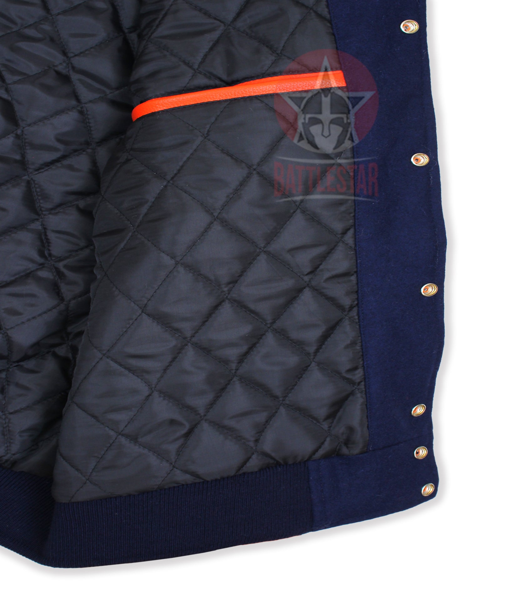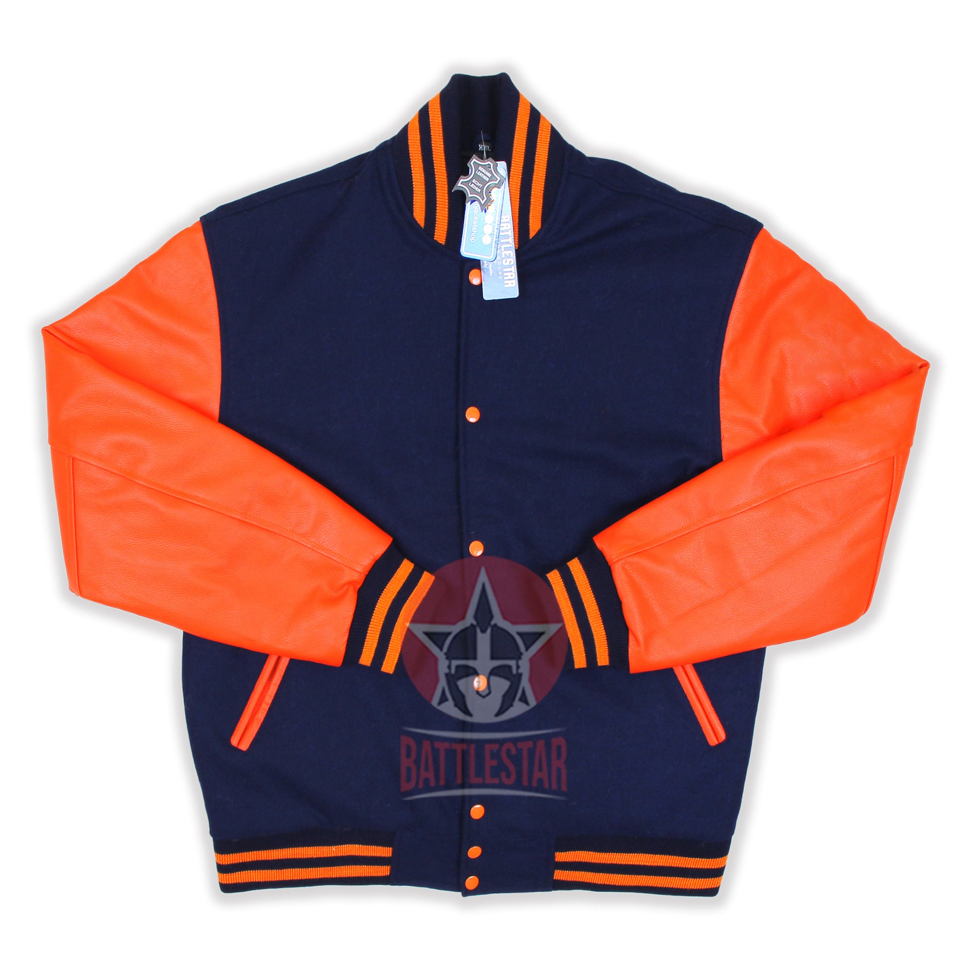 Navy Blue Wool Varsity Jacket Orange Leather Sleeves