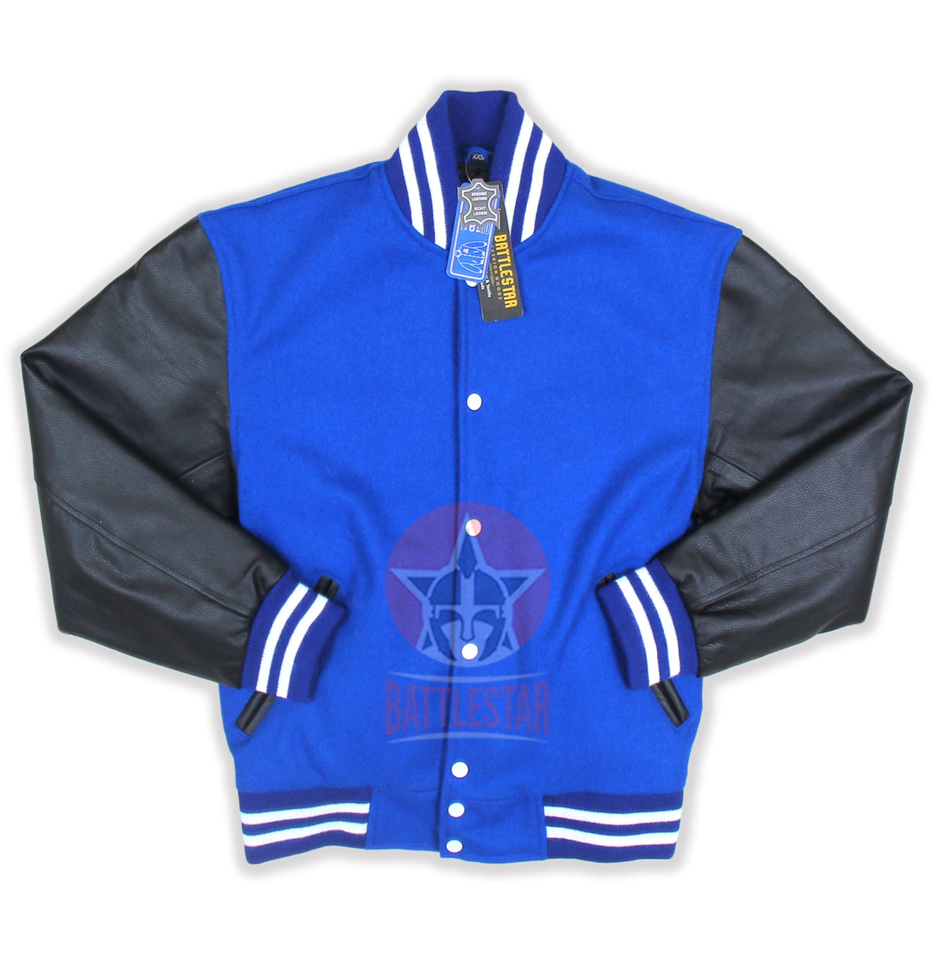 Royal Blue Wool Varsity Jacket Black Leather Sleeves