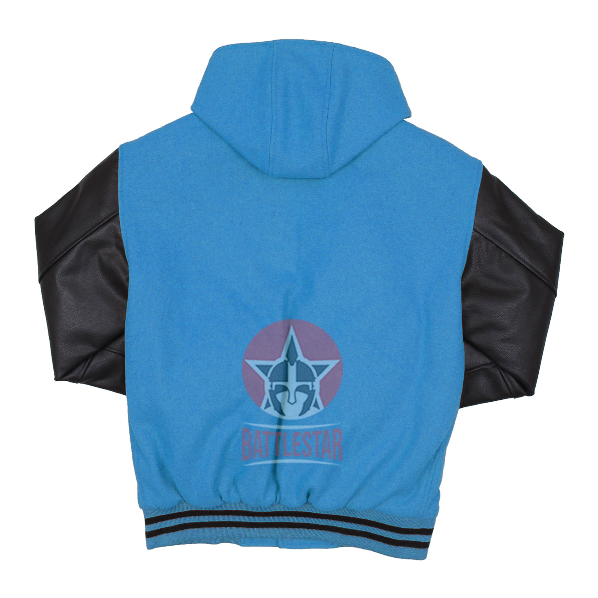 Sky Blue Wool Black Leather Hooded Baseball Letterman Varsity Jacket